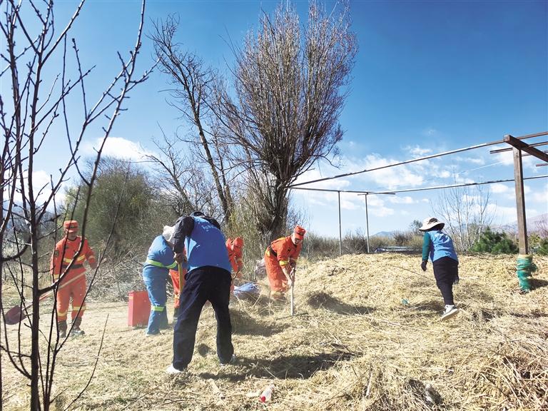 西藏森林消防總隊(duì)特勤大隊(duì)和濕地巡護(hù)人員清理可燃物。記者 王靜 攝