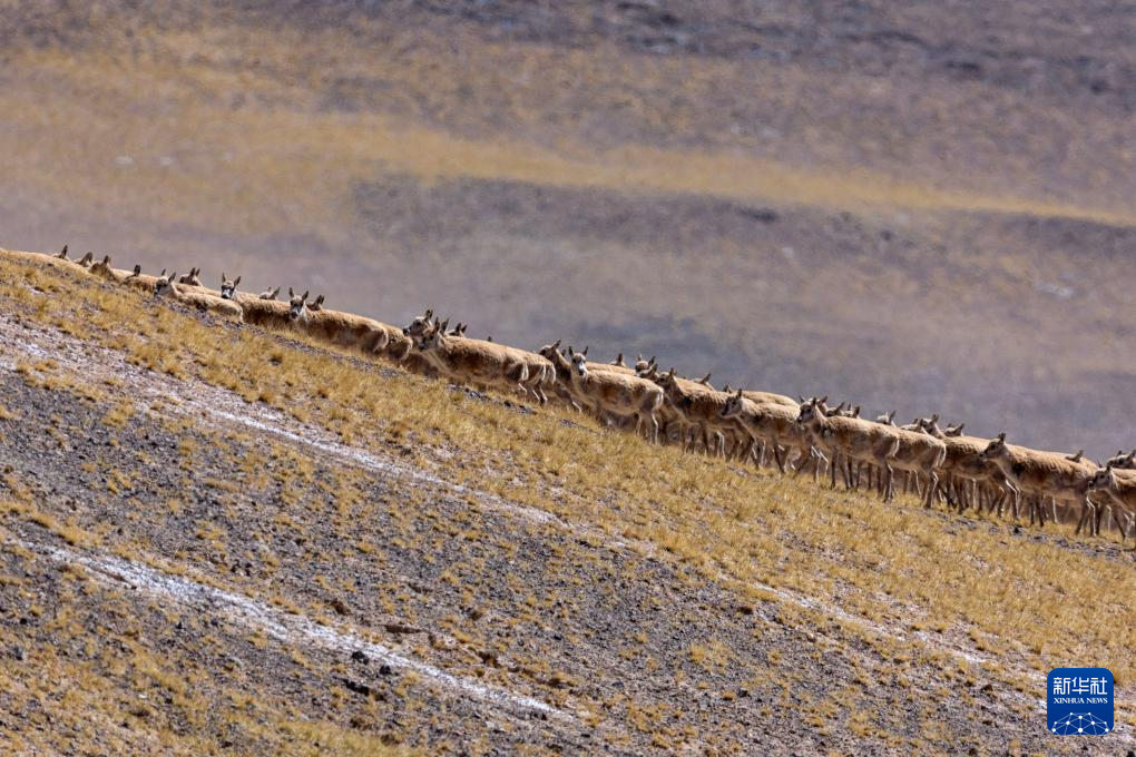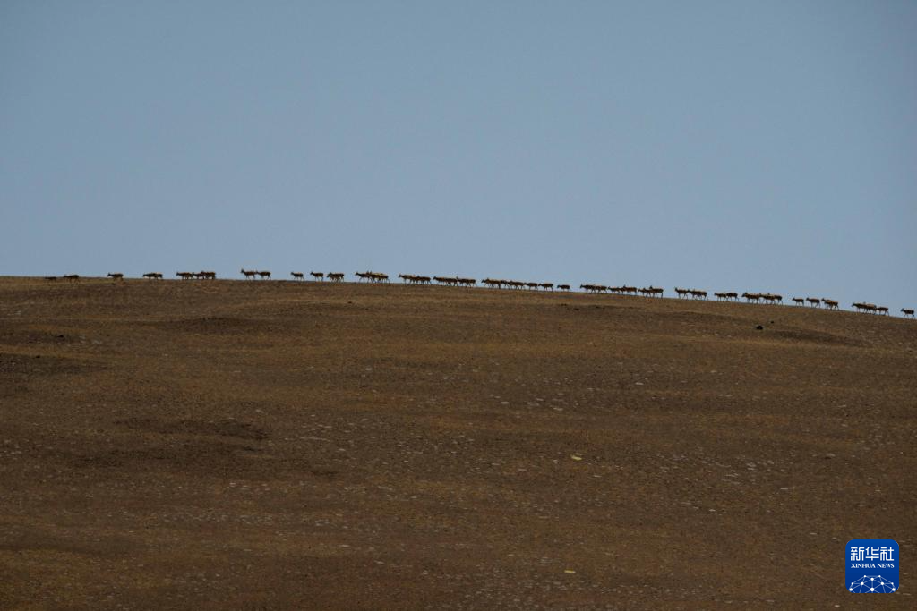 在羌塘國(guó)家級(jí)自然保護(hù)區(qū)核心區(qū)拍攝的遷徙中的雌藏羚羊群(6月9日攝)。新華社記者 旦增尼瑪曲珠 攝