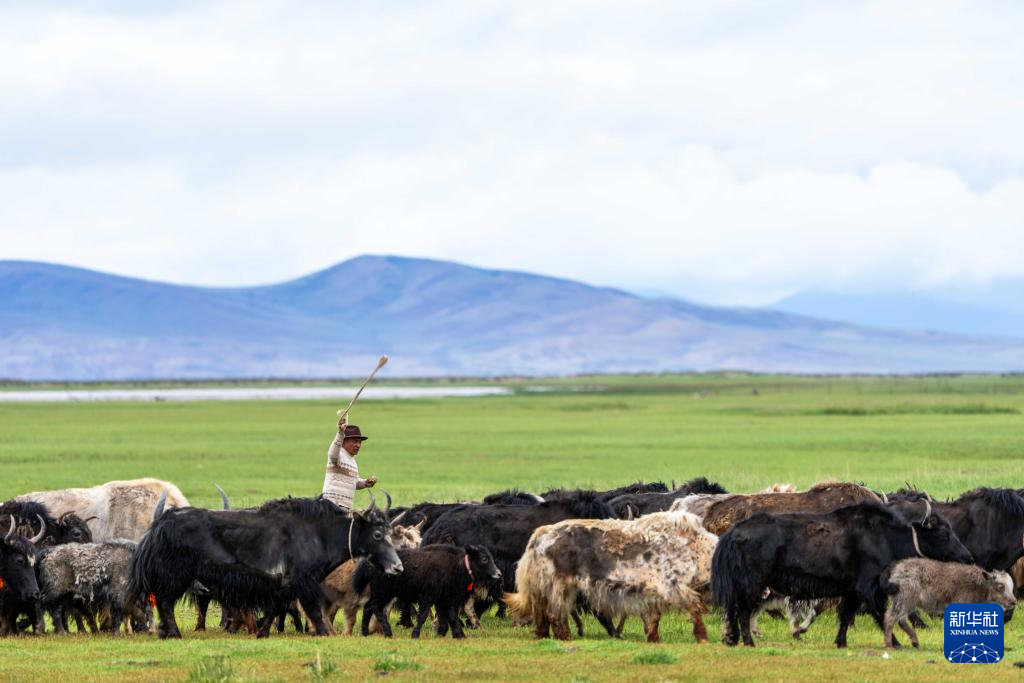 7月22日拍攝的瑪旁雍錯濕地上的牦牛。新華社記者 旦增尼瑪曲珠 攝