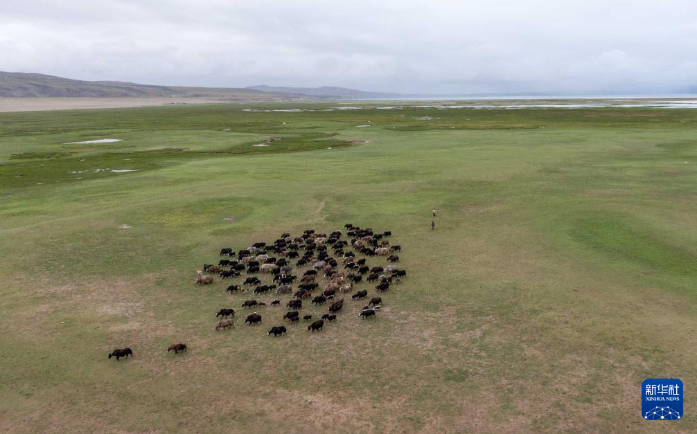 7月22日拍攝的瑪旁雍錯濕地上的牦牛(無人機照片)。新華社記者 旦增尼瑪曲珠 攝
