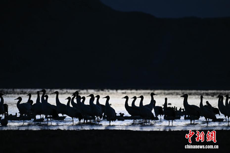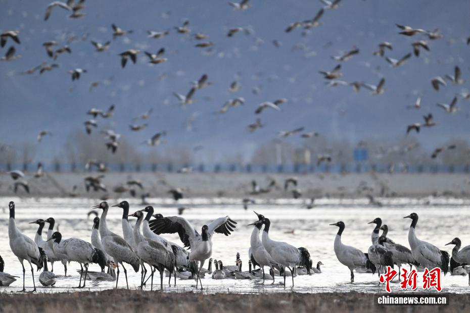 11月26日,位于西藏自治區(qū)拉薩市林周縣的黑頸鶴自然保護區(qū)內,大量越冬的黑頸鶴在卡孜水庫、農田、濕地里覓食、嬉戲。林周縣位于拉薩河上游及澎波河流域,是黑頸鶴的主要越冬地之一。中新社記者 貢嘎來松 攝