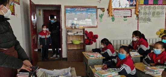 3月30日上午10時,記者在西藏那曲市浙江中學門口看到同學們穿著干凈整潔的校服,在老師們的統(tǒng)一指揮下依次排隊前后間隔一米距離,按順序測量著體溫、擦拭著免洗手液、換戴學校發(fā)放的新口罩走向教室。