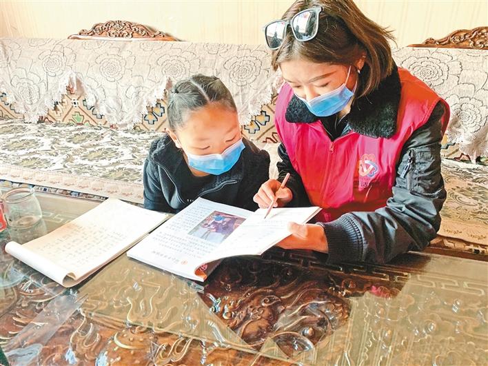 西藏那曲索縣“四講四愛”宣講團成員在進行入戶宣講的同時,積極開展送教活動。圖為索縣廣電中心副主任科員兼“四講四愛”辦工作人員次仁德吉入戶為學生輔導課后作業(yè)。記者 萬靖 張宇 攝