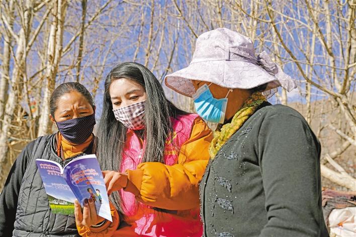 圖為近日,西藏山南市瓊結(jié)縣“四講四愛”群眾教育實(shí)踐活動辦工作人員為村民宣講疫情防控知識及“講文明愛生活”內(nèi)容。 記者 耿銳仙 攝