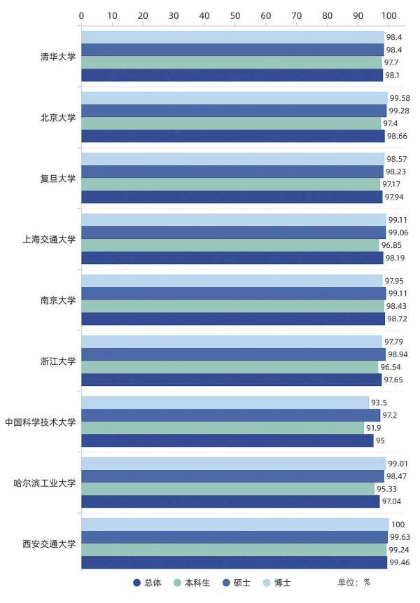其中,最高的是西安交通大學(xué),畢業(yè)生就業(yè)率達(dá)99.46%;最低的是中國(guó)科學(xué)技術(shù)大學(xué),畢業(yè)生就業(yè)率為95%。