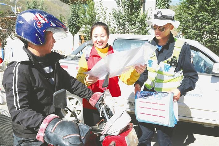 圖為瓊結(jié)縣新時代文明實(shí)踐中心志愿者向行人發(fā)放“文明交通 從我做起”宣傳資料。