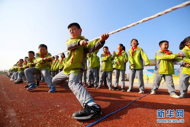 11月12日,學生在大課間參加拔河比賽。 位于山東省青島市即墨區(qū)的青島藍谷高新區(qū)東皋埠小學是一所鄉(xiāng)村學校,近年來,學校開展以乒乓球、籃球、跳繩等運動為主的大課間活動,讓孩子們在享受運動的同時愉悅身心,增強體質。 新華社發(fā)(梁孝鵬攝)