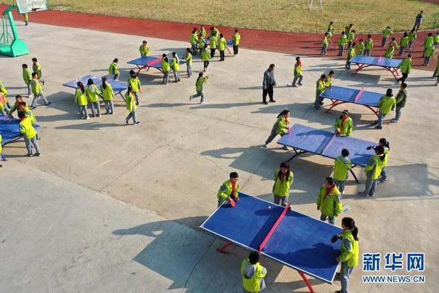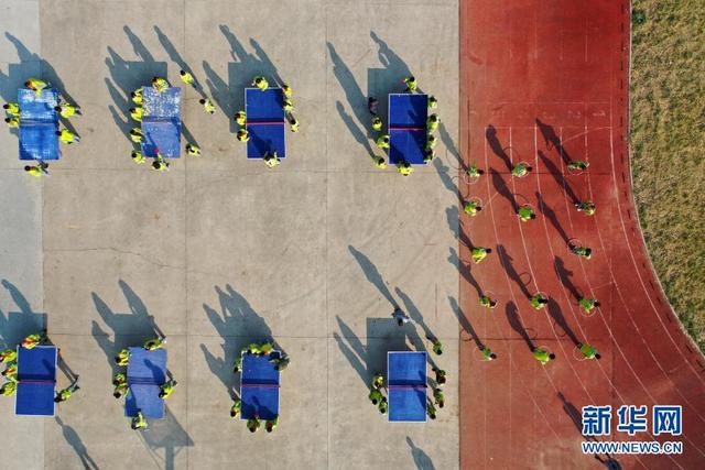 11月12日,學生在大課間打乒乓球(無人機照片)。 位于山東省青島市即墨區(qū)的青島藍谷高新區(qū)東皋埠小學是一所鄉(xiāng)村學校,近年來,學校開展以乒乓球、籃球、跳繩等運動為主的大課間活動,讓孩子們在享受運動的同時愉悅身心,增強體質。 新華社發(fā)(梁孝鵬攝)