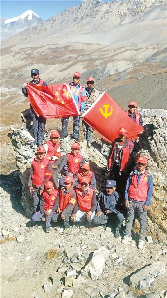 圖為吉隆縣貢當(dāng)鄉(xiāng)樟村黨員先鋒隊在通外山口巡邏過程中與國旗、黨旗合影。索朗瓊珠 次仁片多 攝