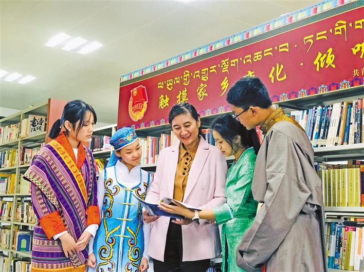 共青團西藏自治區(qū)委員會副書記格桑卓瑪(中),在武漢西藏中學(xué)設(shè)立的“觸摸家鄉(xiāng)變化·傾聽黨的聲音”主題書刊欄處向?qū)W生們介紹相關(guān)書籍。