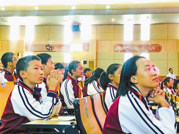 珠海四中內(nèi)地西藏班師生認真聽取報告。
