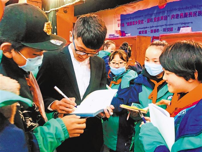 宣講活動過程中,共青團西藏自治區(qū)委員會副書記格桑卓瑪、西藏青年報社副社長洛桑頓珠給6所學(xué)校內(nèi)地西藏班的學(xué)生們贈送了《西藏青年報》《西藏青年》等刊物和書籍。格桑卓瑪語重心長地囑咐孩子們:“作為新時代的新青年,要時刻牢記時代賦予的新使命,要用新時代的標(biāo)尺審視自己,用科學(xué)文化武裝自己,淡化宗教消極影響,在新征程的熔爐中鍛造自己,努力使自己成為堪當(dāng)民族復(fù)興大任的新青年,在全面建設(shè)社會主義現(xiàn)代化國家新征程中貢獻自己的青春力量,做神圣國土的守護者、幸福家園的建設(shè)者,在青春的閃光中踐行‘感黨恩、愛核心、聽黨話、跟黨走’的家國情懷?!?/p>