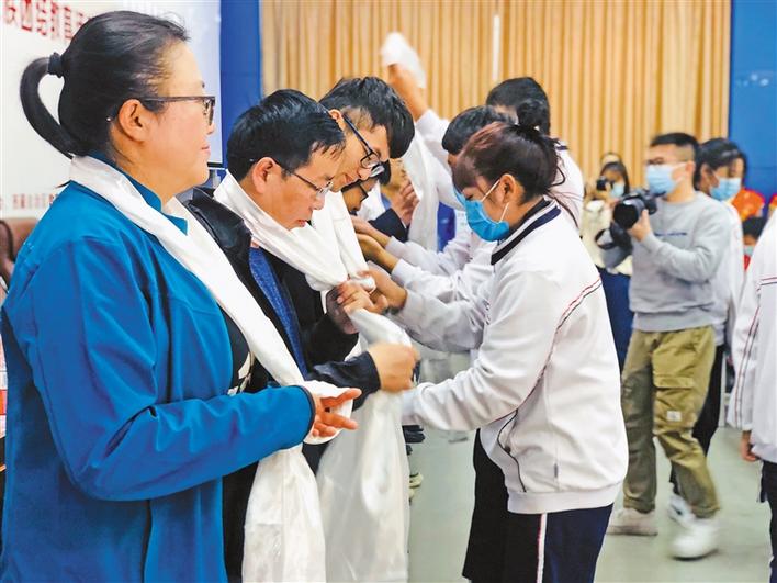 內(nèi)地西藏班師生為宣講組敬獻哈達。