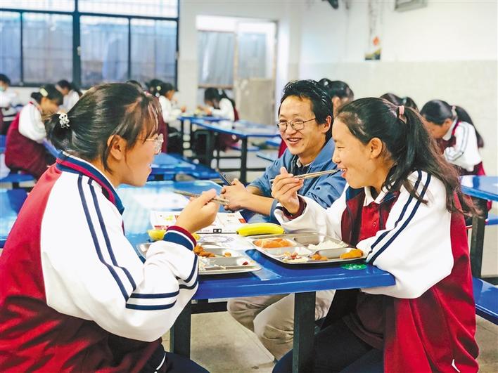 西藏青年報社副社長洛桑頓珠(右二)在珠海四中學(xué)校食堂與內(nèi)地西藏班學(xué)生進行交談。
