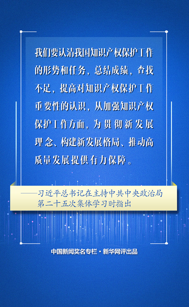 近日,中共中央政治局就加強我國知識產(chǎn)權(quán)保護工作舉行第二十五次集體學(xué)習(xí),習(xí)近平總書記在主持學(xué)習(xí)時發(fā)表重要講話,回顧總結(jié)我國知識產(chǎn)權(quán)保護工作取得的歷史性成就,深刻闡述知識產(chǎn)權(quán)保護工作的重要性,對全面加強知識產(chǎn)權(quán)保護工作提供了明確思路和行動指南。