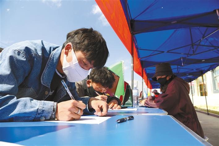 圖為瓊結(jié)籍大學(xué)生在招聘會(huì)現(xiàn)場(chǎng)填寫簡(jiǎn)歷。倫珠澤仁 記者 洛桑 攝