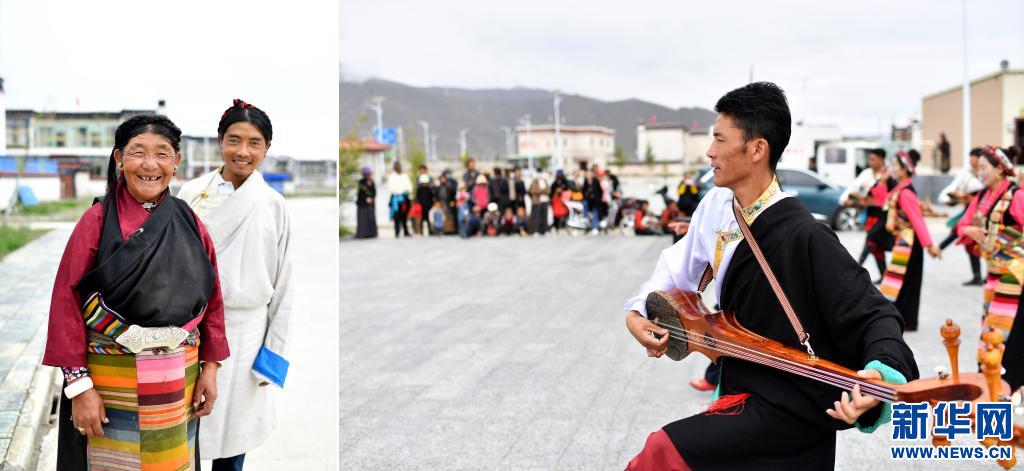 拼版照片:左圖為西藏日喀則市拉孜縣查務(wù)鄉(xiāng)明瑪村村民倉(cāng)瓊(左)和兒子群培次仁;右圖為拉孜縣民間藝術(shù)團(tuán)在明瑪村易地搬遷點(diǎn)為村民表演(2020年8月2日攝)。新華社記者 詹彥 攝