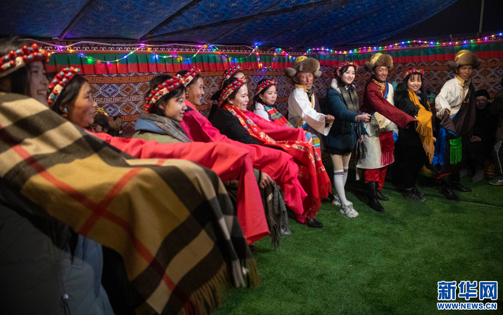西藏日喀則市扎西宗鄉(xiāng)巴松村發(fā)展旅游產(chǎn)業(yè),當(dāng)?shù)剞r(nóng)牧民和游客一起跳起民族舞蹈(2020年1月20日攝)。新華社記者 孫非 攝