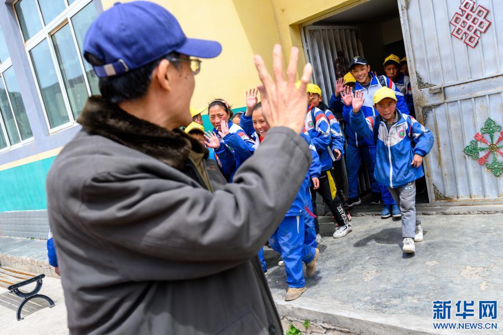 5月4日,在西藏昌都市類烏齊縣長毛嶺鄉(xiāng)第一小學,學生們向李純民道別。新華社記者 劉金海 攝