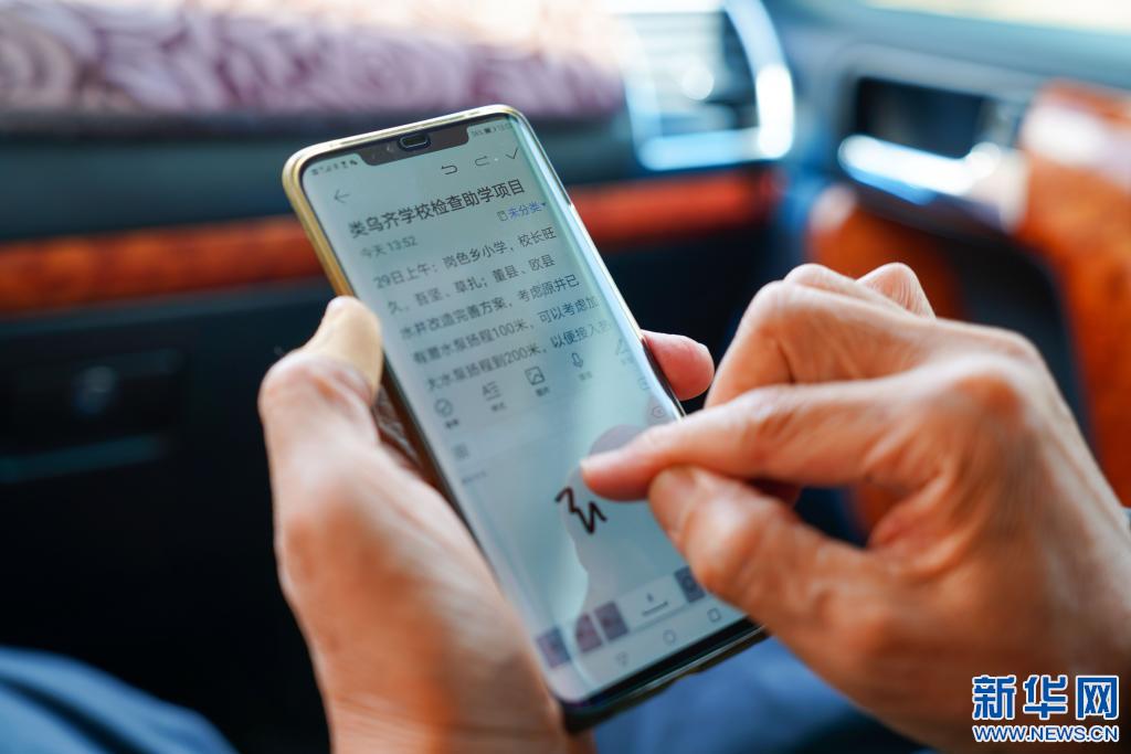 5月1日,李純民在前往西藏昌都市類烏齊縣伊日鄉(xiāng)小學途中,整理記錄此次進藏助學事宜。新華社記者 黃臻 攝