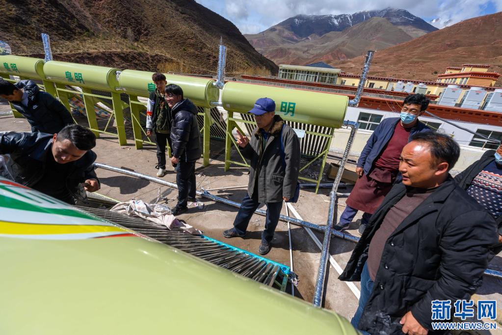5月3日,在西藏昌都市類烏齊縣吉多鄉(xiāng)小學,李純民(中)在吉多鄉(xiāng)小學學生食堂樓頂,監(jiān)督太陽能熱水器的維修工作。2014年至2020年,“齊興”助學獎勵基金通過多種方式,籌集資金200多萬,為類烏齊縣12所鄉(xiāng)鎮(zhèn)小學安裝太陽能熱水器和多媒體教學一體機。新華社記者 劉金海 攝