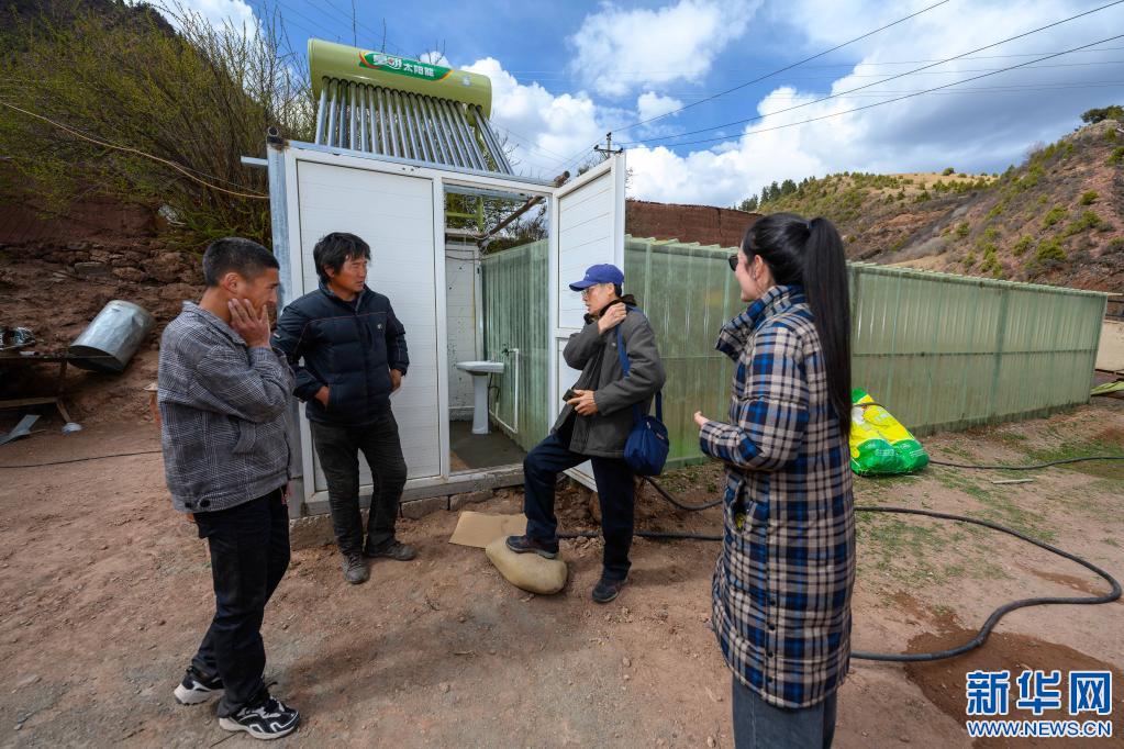 5月2日,在西藏昌都市類烏齊縣濱達鄉(xiāng)濱達村,李純民(左二)在當?shù)卮迕裣虬桶偷牵ㄓ叶┘抑胁榭凑託夤薜氖褂们闆r。新華社記者 劉金海 攝