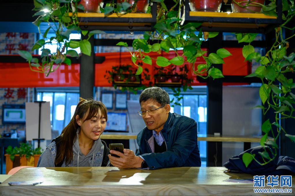 4月22日,在天津大學一學生食堂,李純民(右)與“齊興”助學獎勵基金資助的藏族學生扎西措姆交流。新華社記者 劉金海 攝