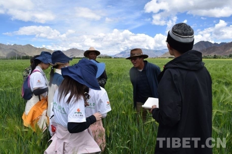 圖為中國農(nóng)業(yè)大學(xué)人文科考隊在青稞田里了解情況