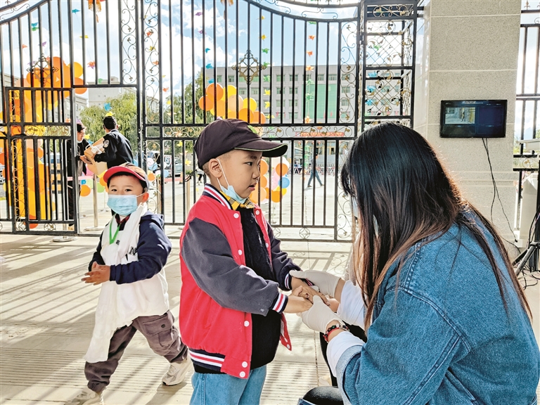 圖為在拉薩江蘇實(shí)驗(yàn)幼兒園門口,老師對入園幼兒進(jìn)行手部檢查。拉薩融媒記者 余洋洋攝