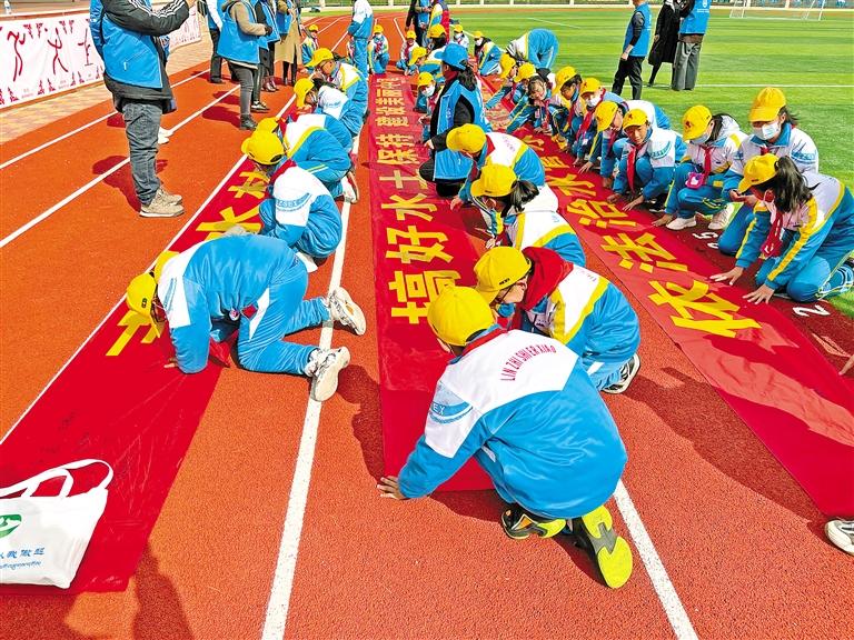 林芝市第二小學(xué)的學(xué)生們在愛護(hù)水土資源宣傳標(biāo)語上簽名