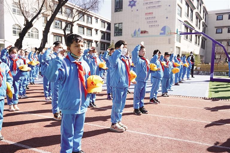 同樣,拉薩市城關(guān)區(qū)第二小學(xué)在開學(xué)第一天,舉行了2022年春季開學(xué)典禮暨創(chuàng)建鑄牢中華民族共同體意識示范學(xué)校啟動儀式。從學(xué)生走入校門,到開學(xué)第一課“剛健有為、自強(qiáng)不息”,再到升國旗儀式,全體師生以嶄新的面貌,飽滿的熱情,積極投入到新學(xué)期的工作學(xué)習(xí)中。