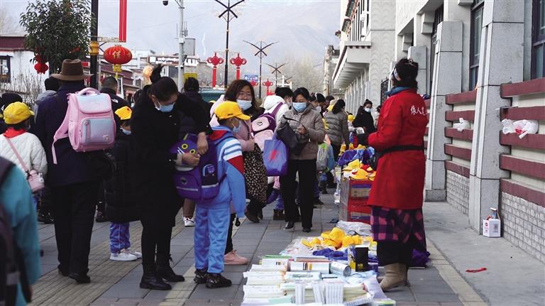 10日早上8時20分許,小學(xué)生們佩戴鮮艷的紅領(lǐng)巾、頭戴小黃帽,陸陸續(xù)續(xù)走進(jìn)拉薩市第一小學(xué)的校門。今年春季開學(xué)第一天,有些家長蹲在孩子面前,幫忙整理衣帽,同時鼓勵孩子“加油!”。