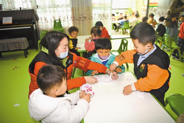 圖為孩子們?cè)诶蠋熤笇?dǎo)下為媽媽制作禮物。記者 王敏 攝