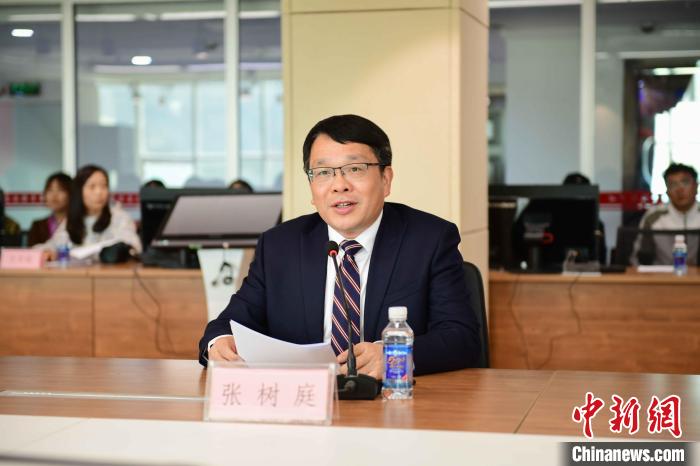 圖為西藏民族大學(xué)黨委常委、副校長,中國傳媒大學(xué)黨委常委、副校長張樹庭在簽約儀式上講話?!∝暩聛硭?攝