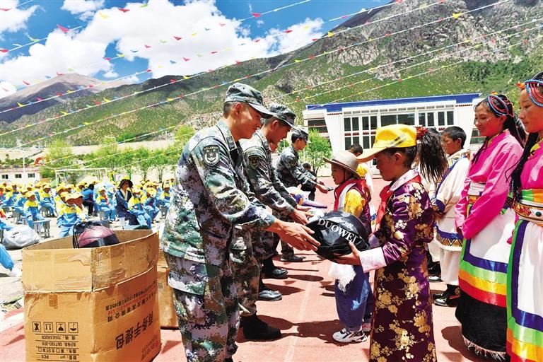 近日,李家偉與戰(zhàn)友一起,利用端午節(jié)假期,前往拉薩市林周縣阿朗鄉(xiāng)雙語小學(xué),將他們用正能量獎金購買的愛心物資送到了孩子們的手中。