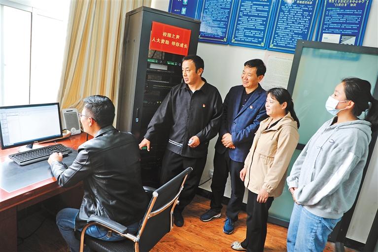 圖為墨竹工卡縣人大常委會(huì)黨組書(shū)記、主任張志文(左三)和人大代表一起回訪,了解尼瑪江熱鄉(xiāng)中心小學(xué)更換的廣播系統(tǒng)使用情況。記者 格桑倫珠 裴聰 攝