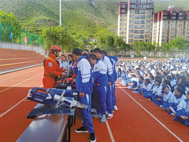 圖為昌都市卡若區(qū)森林消防中隊消防救援人員向?qū)W生展示救援裝備。記者 桑鄧旺姆 通訊員 張強(qiáng) 攝