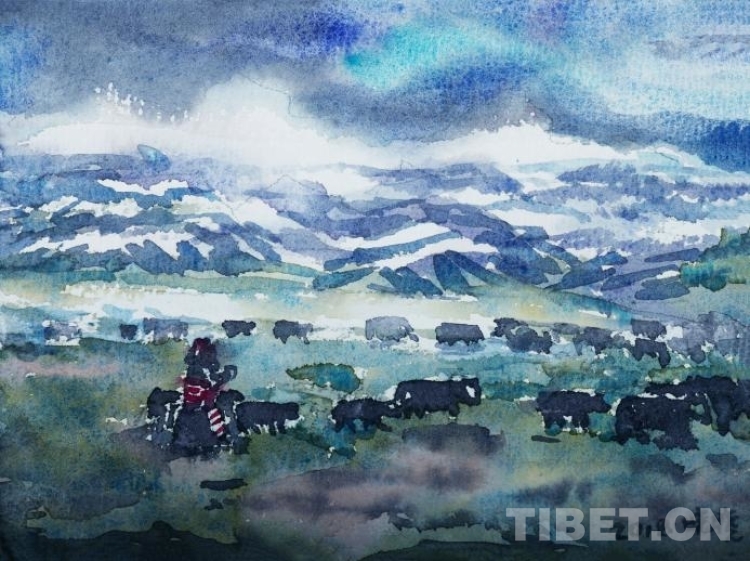 我在那曲草原寫生時(shí),一個(gè)藏族小伙子站在我身旁看我作畫。他說:“你畫的真好看,遠(yuǎn)處的羊群好像在動(dòng)!”他叫拉果,這個(gè)藏族小伙子一直站在我身邊看我把這張畫畫完。我起身要走的時(shí)候,他拉著我說:“中午到我家吃飯吧!”由于我著急趕路,我們互相留了聯(lián)系方式。第二年春天我又來到西藏,拉果非常熱情地邀請(qǐng)我到他家做客。此后我們一直保持聯(lián)系,我有幾幅作品,就是取材于拉果家。