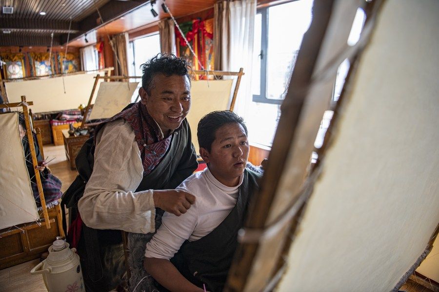 圖為3月9日,在日喀則唐卡畫院,老師洛桑旦達(dá)在教授學(xué)生唐卡繪畫技巧。新華社記者 孫非 攝