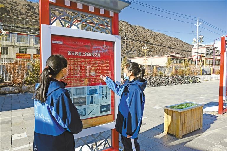 那曲市嘉黎縣中學(xué)民族團(tuán)結(jié)長廊解說員(右)向同學(xué)講解茶馬古道上的民族團(tuán)結(jié)故事。記者 薛瑩 益西加措 攝
