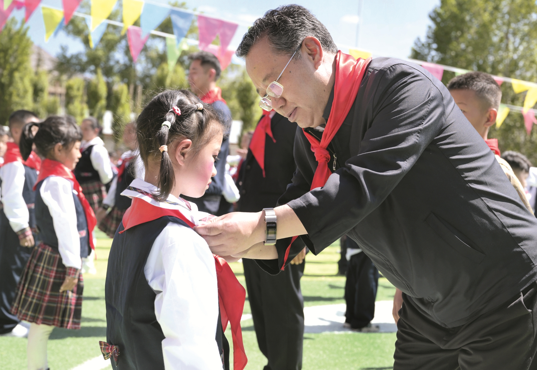 拉薩市第一小學(xué)是西藏和平解放后拉薩開辦的第一所公立小學(xué),建校70年來,為新西藏各項建設(shè)事業(yè)輸送了萬千棟梁人才。來到拉薩市第一小學(xué)江蘇路分校,身著民族服飾的藏族小姑娘南杰拉措為王強一行系上鮮艷的紅領(lǐng)巾,并熱情帶領(lǐng)王強一行走向校園。