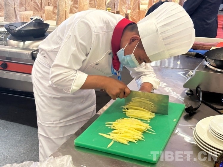 圖為來(lái)自阿里地區(qū)中等職業(yè)技術(shù)學(xué)校的參賽選手桑杰元旦在切土豆絲 攝影:旦曲