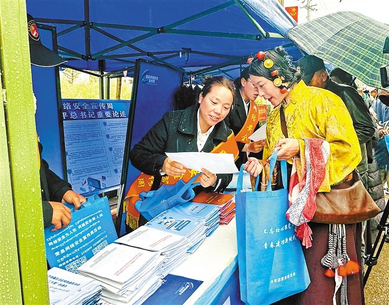 圖為那曲市索縣網(wǎng)信辦工作人員向過往群眾講解網(wǎng)絡(luò)安全知識。記者 曲珍 攝