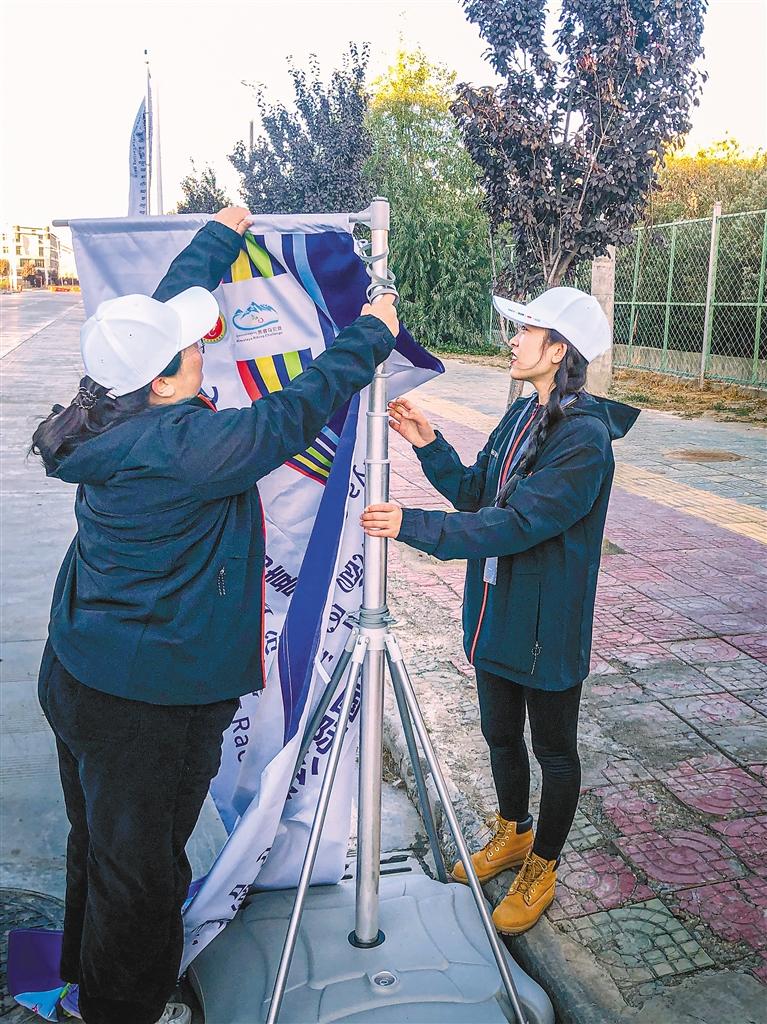 圖為志愿者在比賽起點(diǎn)擺放刀旗。記者 楊子彥 蔣翠蓮 攝