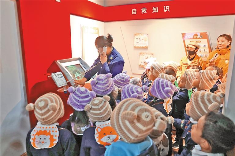 在消防宣傳員引領(lǐng)下,小朋友體驗(yàn)“119”模擬報(bào)警。