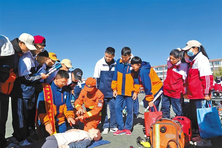 圖為消防員向同學們傳授急救知識。洛桑頓珠 記者 盧文靜 攝