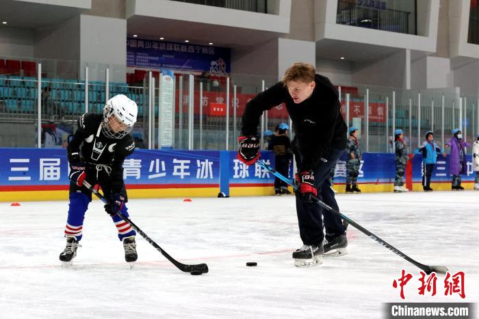 圖為外籍教練手把手教學(xué)冰球射門。薛蒂 攝