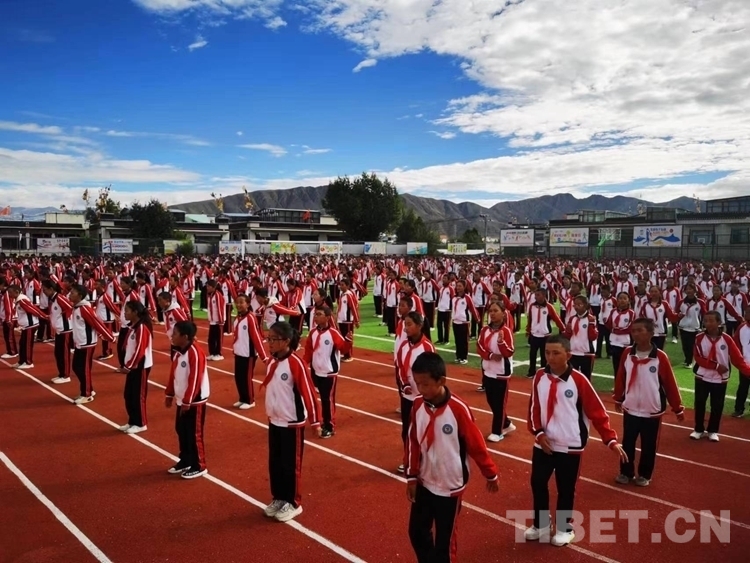 資料圖:日喀則市上海實(shí)驗學(xué)校學(xué)生們正在跳具有民族特色的課間操