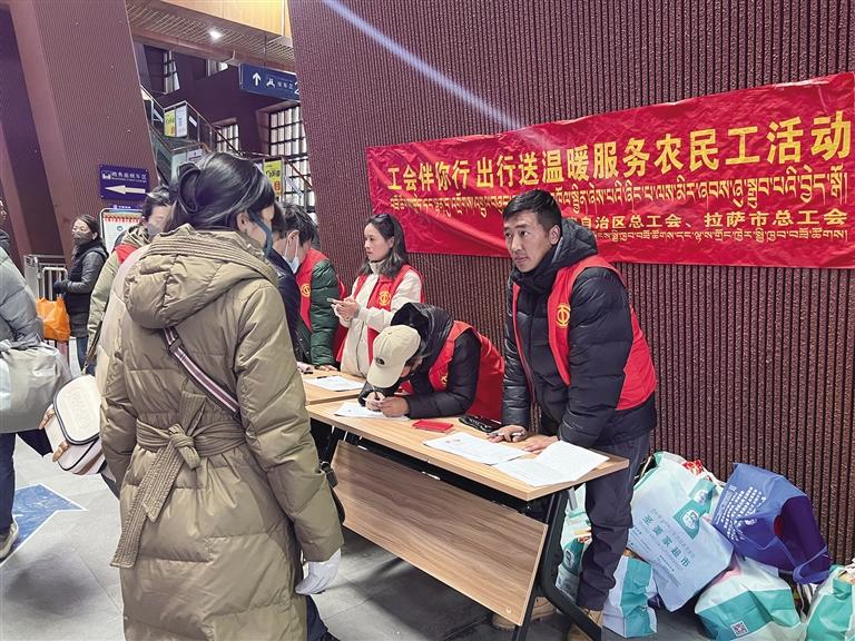 1月31日,西藏自治區(qū)總工會與拉薩市總工會聯(lián)合柳梧新區(qū)公安局應急處突大隊、中國青藏鐵路集團有限公司,在拉薩火車站內(nèi)為返鄉(xiāng)農(nóng)民工發(fā)放1000份“工會愛心大禮包”,并提供乘車咨詢、便民服務、維持秩序等服務,將工會組織的溫暖送到農(nóng)民工心坎上。