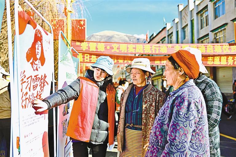 圖為在桑日縣“學(xué)雷鋒·文明實(shí)踐我行動”主題活動啟動儀式現(xiàn)場,志愿者向過往群眾講解雷鋒精神。記者 丹增平措 攝